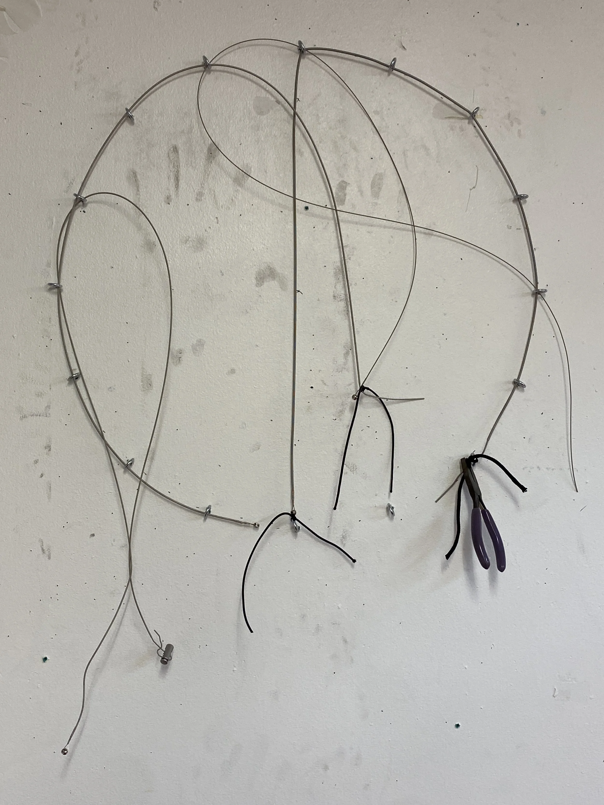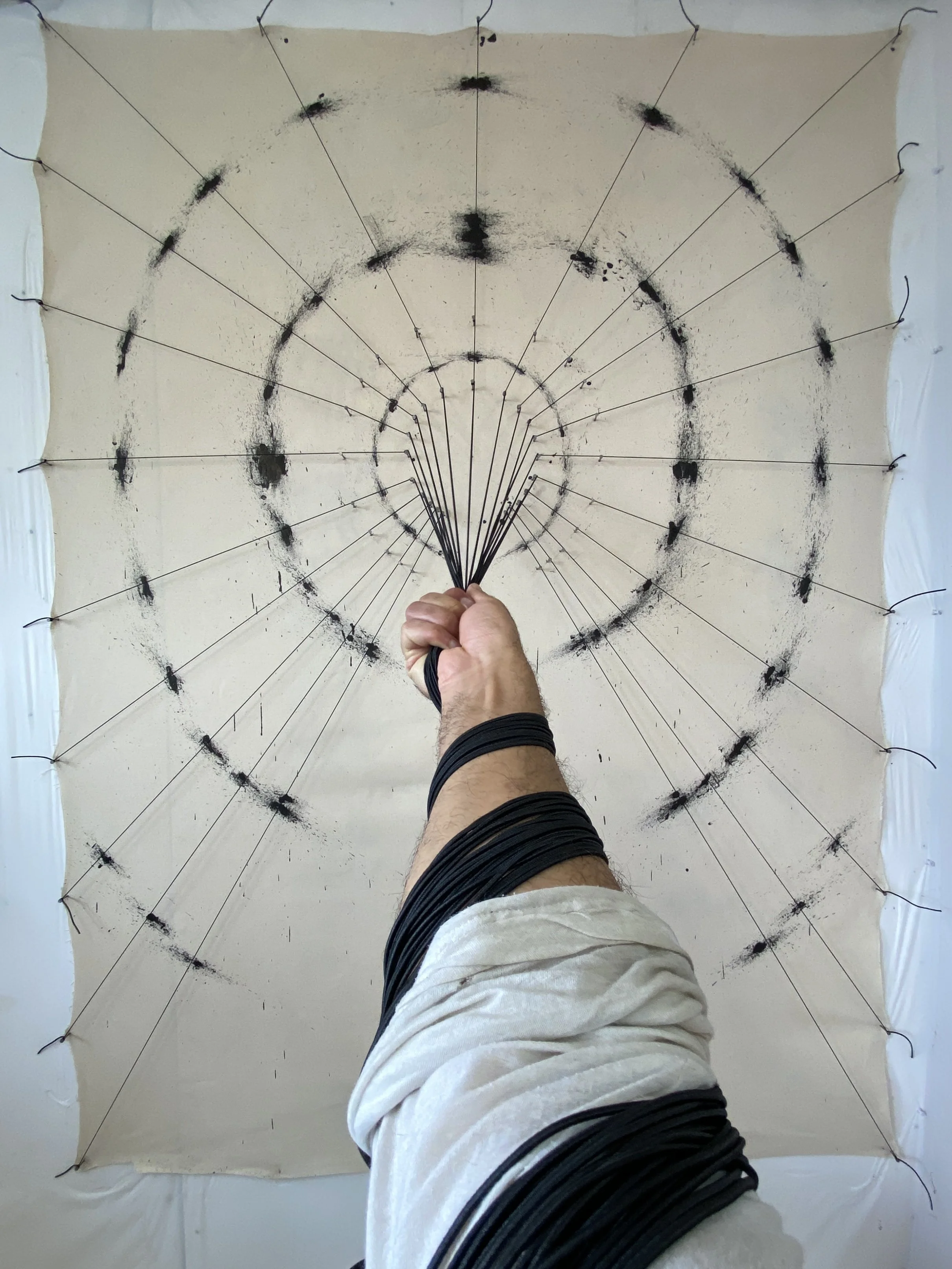 Numinous Instrument Series is three sculptural works activated by the body to create sound. Each piece functions as both object and instrument: two rattles and one stringed form played with inked hands, leaving traces on canvas as a visual record of performance.