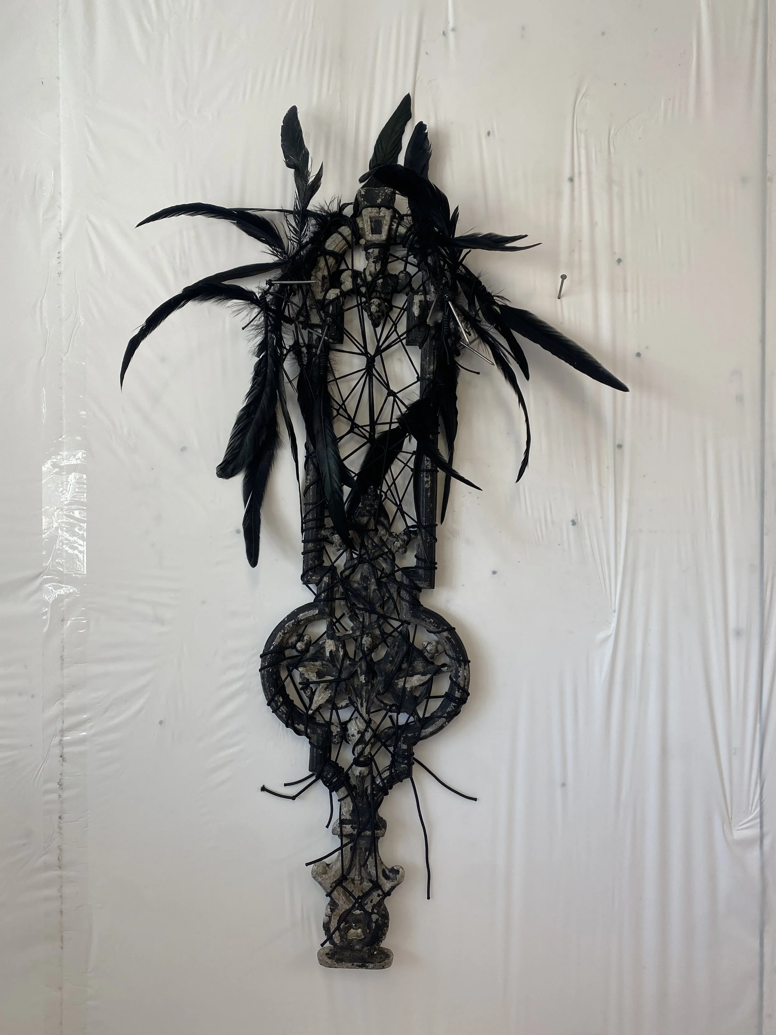 Iron Spindle, Elastic Cord, Human Hair, Peasant Feathers